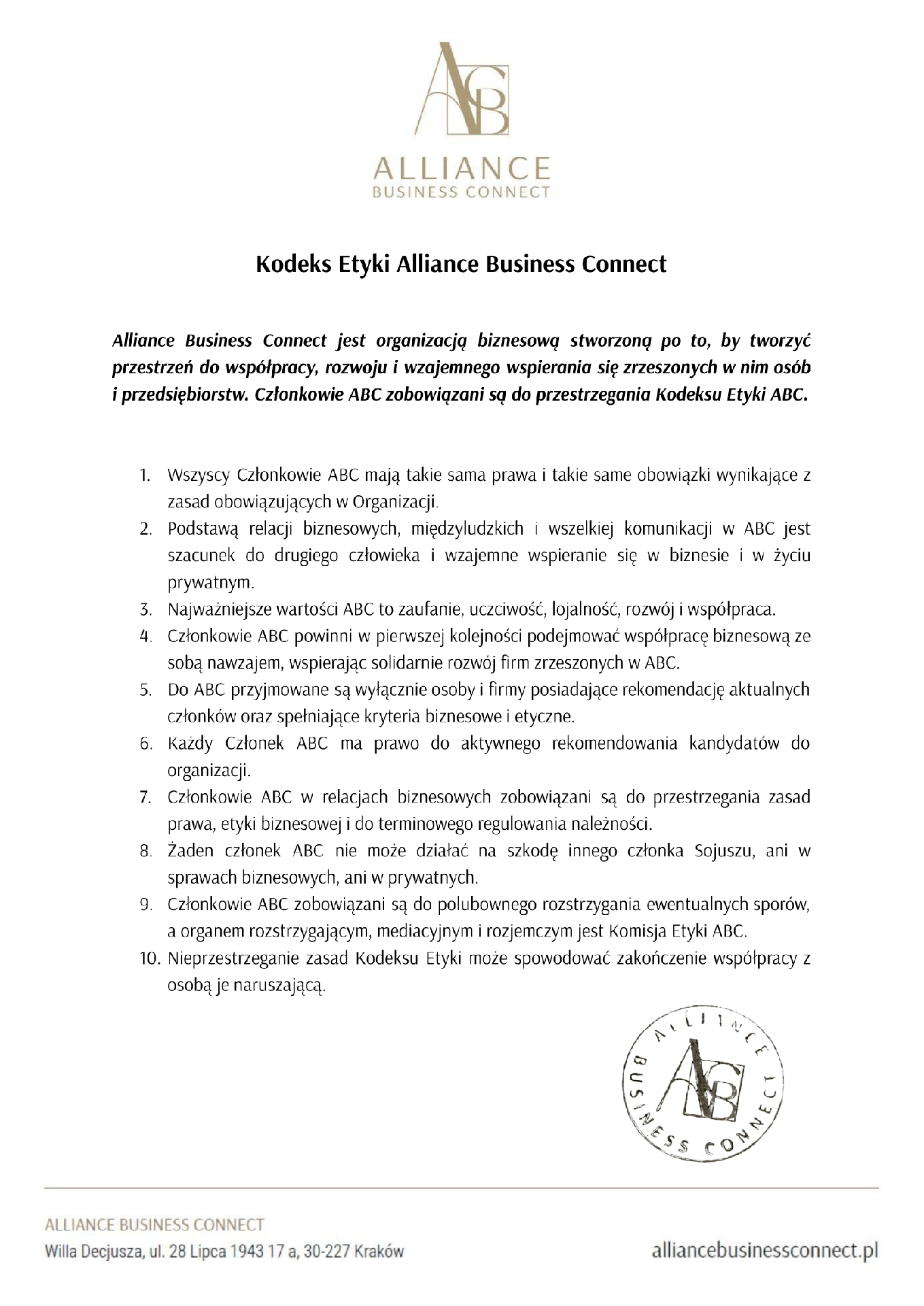 Alliance Business Connect jest organizacją biznesową stworzoną po to, by tworzyć przestrzeń do współpracy, rozwoju i wzajemnego wspierania się zrzeszonych w nim osób i przedsiębiorstw. Członkowie ABC zobowiązani są do przestrzegania Kodeksu Etyki ABC.